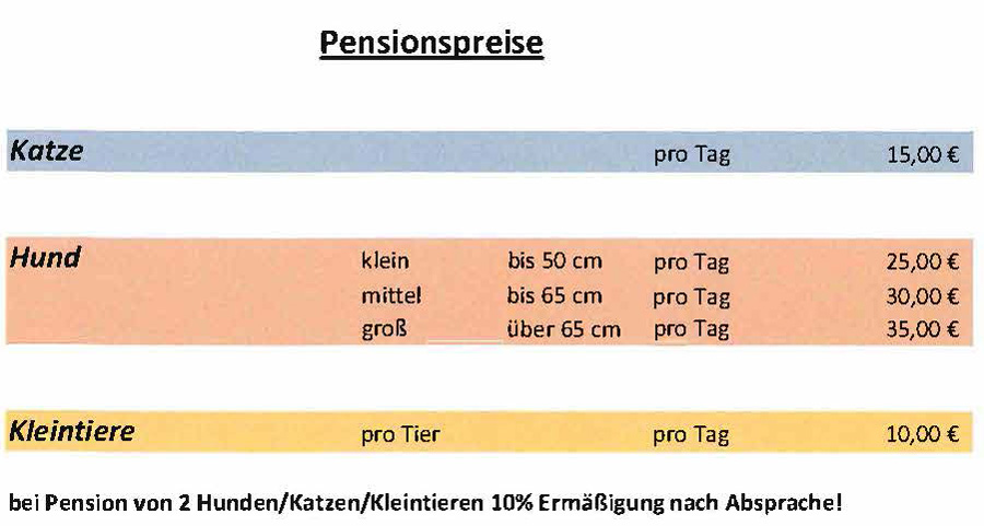 Ab 2024 müssen wir eine Reservierungsgebühr von 25 € pro Tier berechnen, diese wird mit der Pension verrechnet. Bei einer Stornierung wird der Betrag von 25€ als Stornogebühr einbehalten.